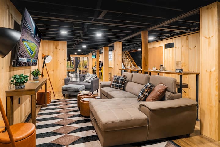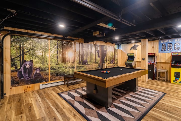 Pool table, shuffleboard, arcade games, darts, ring toss, and a large TV lounge area.